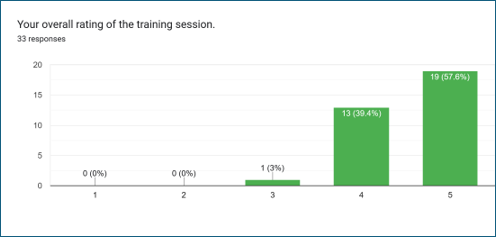 The training session received overwhelmingly positive feedback, with 97% of participants rating it as either "good" or "excellent," reflecting its strong impact and effectiveness. Only 3% rated the session as "average," indicating a highly favorable response overall.